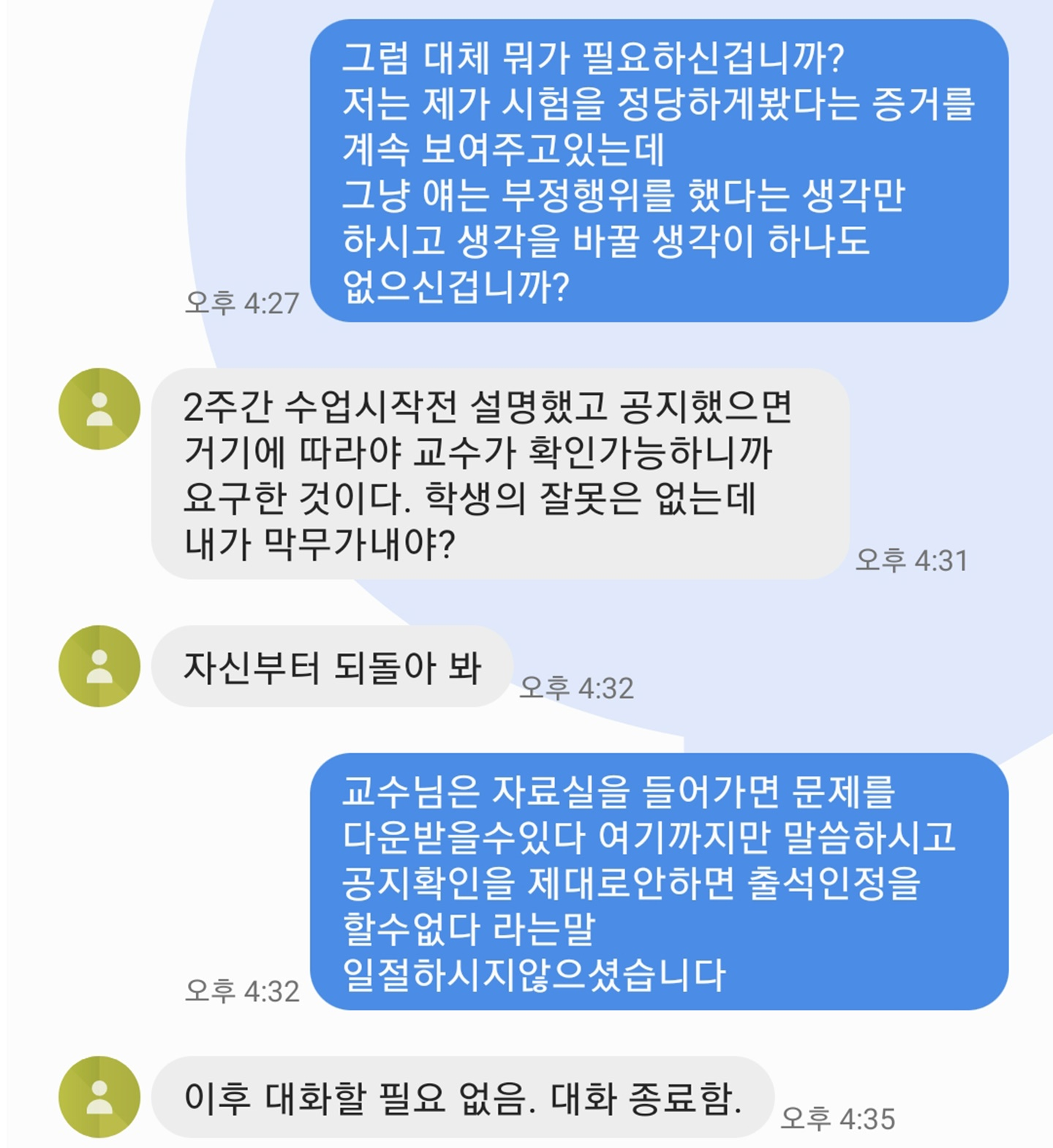 이어 “자신부터 되돌아 봐”라며 “이후 대화할 필요 없음. 대화 종료함”이라 마무리했다.