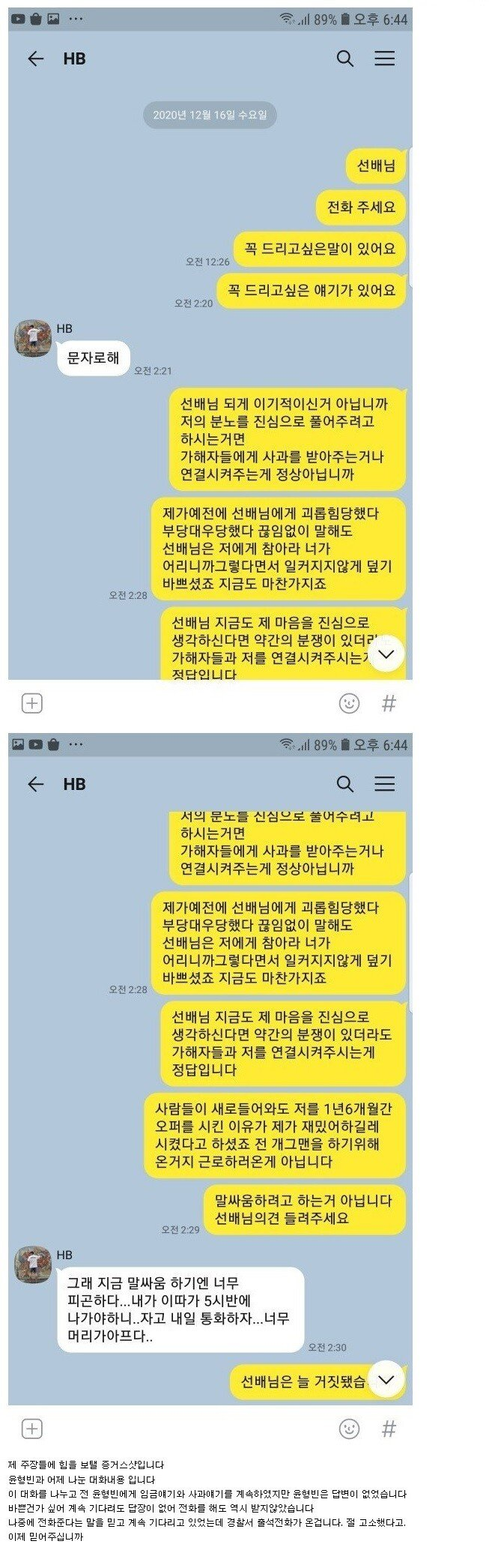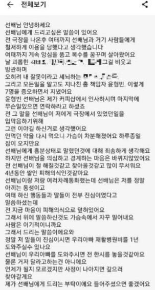 또 다른 장문의 메세지에선 “전 극장을 나온 후 여태까지 선배님에게 철저하게 이용당했다고 생각했다”며 “윤형빈 선배님은 제게 ‘마지막에 무슨 일이 있으면 연락하라’고 하셨다”고 적었다.