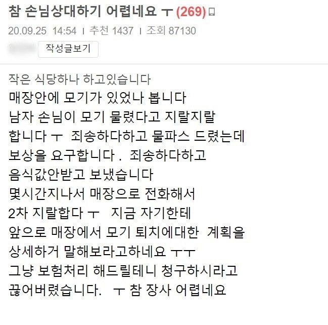 이에 A 씨는 “그냥 보험처리 해드릴테니 청구하시라”고 하고 전화를 끊었다. 그는 “참 장사 어렵다”며 자영업자로서의 설움을 토로하며 글을 마무리했다.