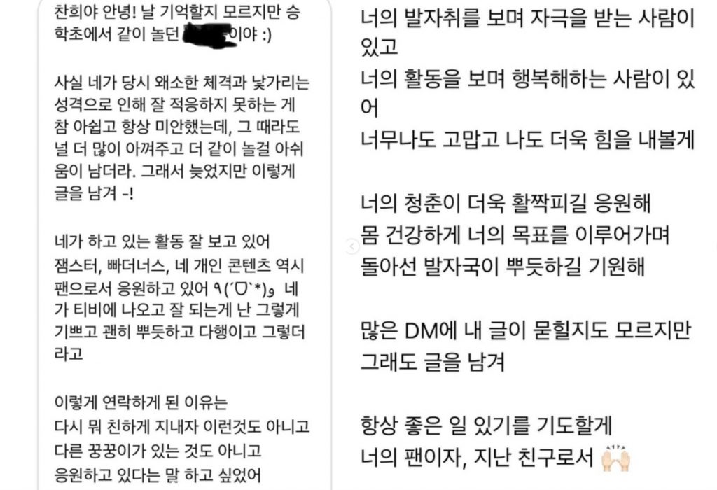 끝으로 “너의 발자취를 보며 자극을 받는 사람이 있고 너의 활동을 보며 행복해하는 사람이 있어. 너무나도 고맙고 나도 더욱 힘을 내볼게”라면서 “너의 팬이자, 지난 친구로서”라고 남겼다.