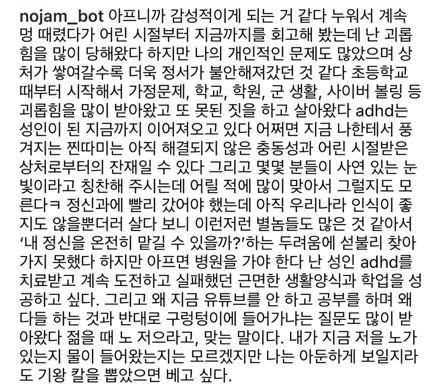 노잼봇은 “어린 시절부터 지금까지를 회고해 봤는데 난 괴로힘을 많이 당해왔다”라며 “초등학교 때부터 시작해서 가정 문제, 학교, 학원, 군 생활, 사이버 볼링 등 괴롬힘을 많이 받아왔고 또 못된 짓을 하고 살아왔다”라고 말했다.