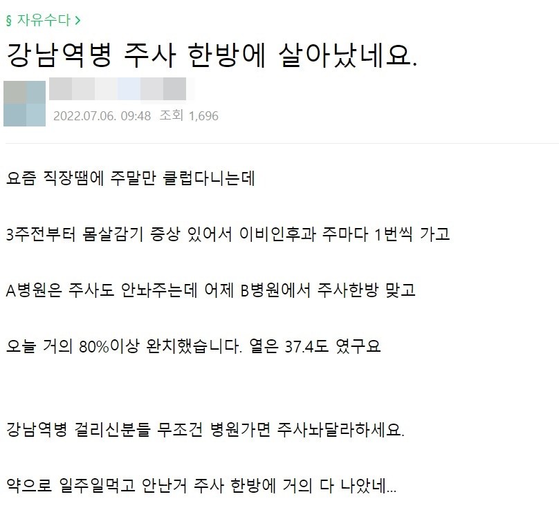 최근 강남 소재 클럽에 방문했다가 심한 감기 증상을 느꼈다는 이가 자신의 경험담을 온라인 커뮤니티에 글을 작성했다.