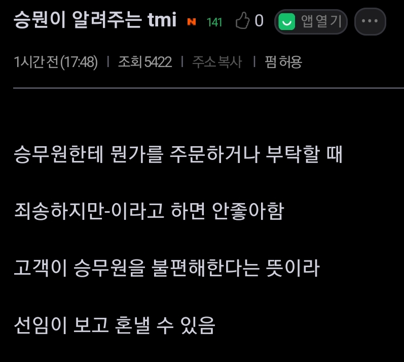 승무원으로 보여지는 글쓴이는 승무원한테 뭔가를 주문하거나 부탁을 할 때 해서는 안 되는 말이 있다고 한다.