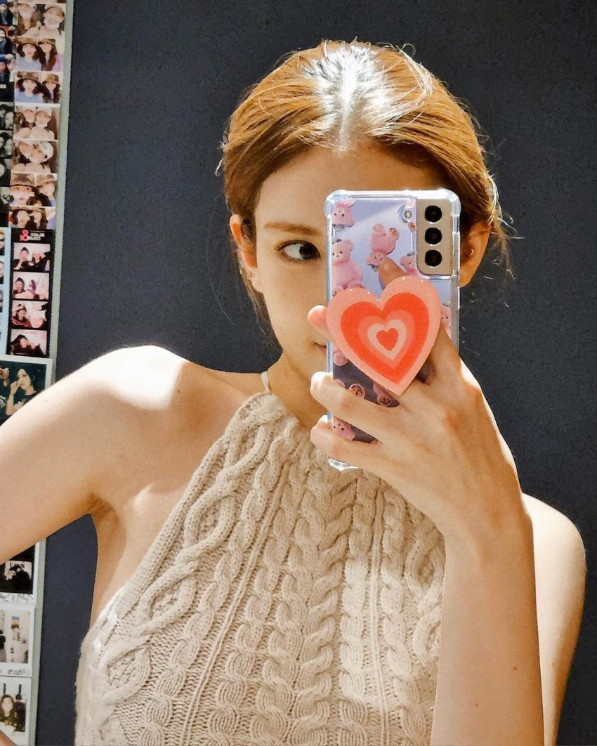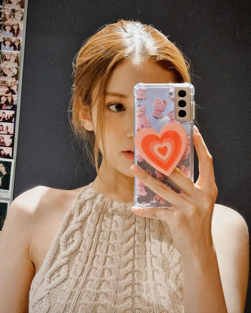 사진 속에는 하얀색 반소매 니트를 입고 거울 셀카를 찍고 있는 전소미의 모습이 담겼다.