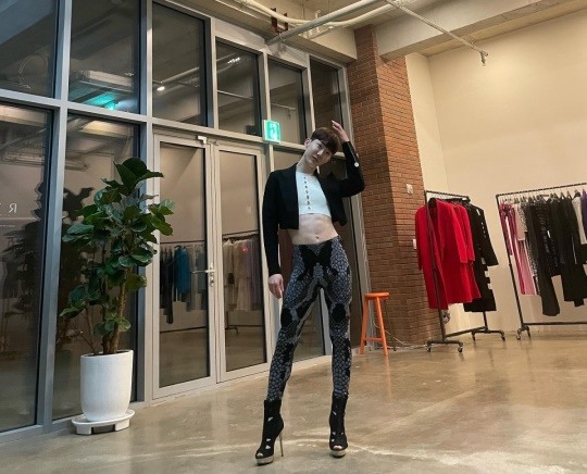 공개된 게시물 속에서 조권은 연보라색 크롭니트에 레깅스 팬츠를 입고 포즈를 취하고 있었다.