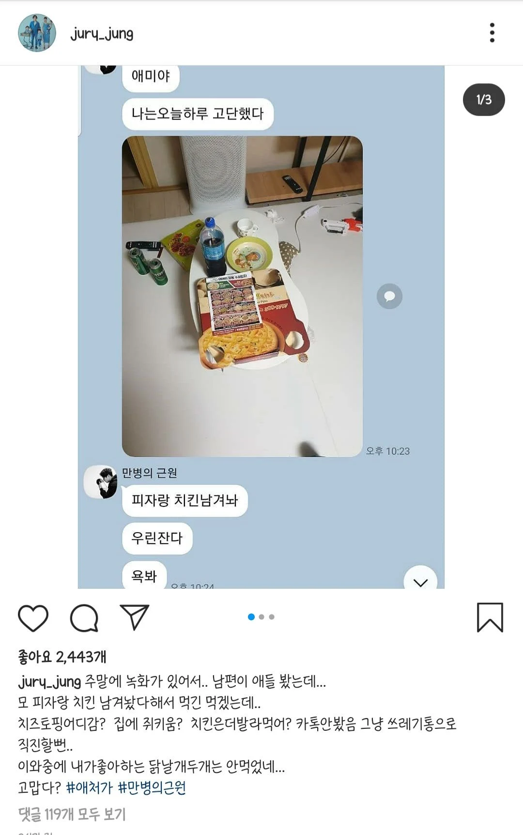 이어 “이와중에 내가 좋아하는 닭날개 두 개는 안 먹었네. 고맙다? #애처가 #만병의 근원”이라 덧붙였다.