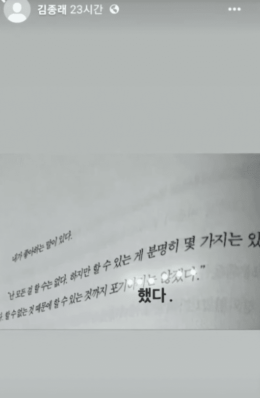 그가 올렸던 사진 속 책에는 “내가 좋아하는 말이 있다. 난 모든 걸 할 수는 없다. 하지만 할 수 있는 게 분명이 몇 가지는 있다. 할 수 없는 것 때문에 할 수 있는 것까지 포기하지는 않겠다“라고 적혀있었다.