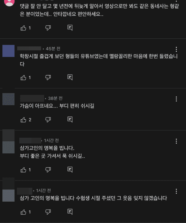 해당 소식을 접한 네티즌들은 “학창시절 즐겁게 보던 유튜브였는데 너무 마음이 안좋네요”, “삼가 고인의 명복을 빕니다”, “가슴이 아프네요”, “편히 쉬시길” 등 애도의 댓글을 남겼다.