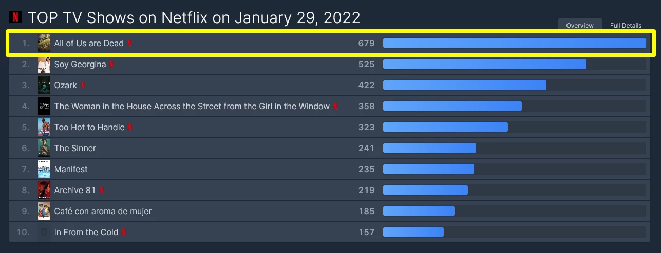 지난 달 30일 OTT 순위 집계 사이트 플릭스 패트롤에 따르면 ‘지금 우리 학교는’은 총점 679점으로 넷플릭스 TV 프로그램 글로벌 1위 자리에 올랐는데, 이는 한국 오리지널 TV시리즈로 ‘오징어 게임’과 ‘지옥’에 이어 세 번째로 1위를 차지한 셈이다.