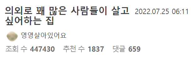 한 온라인 커뮤니티에서는 이에 관련해 “의외로 꽤 많은 사람들이 살고 싶어하는 집”이라는 제목의 글이 올라왔다.