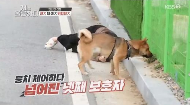 이에 뭉치 목줄을 잡고 있던 보호자도 넘어져 버렸다.