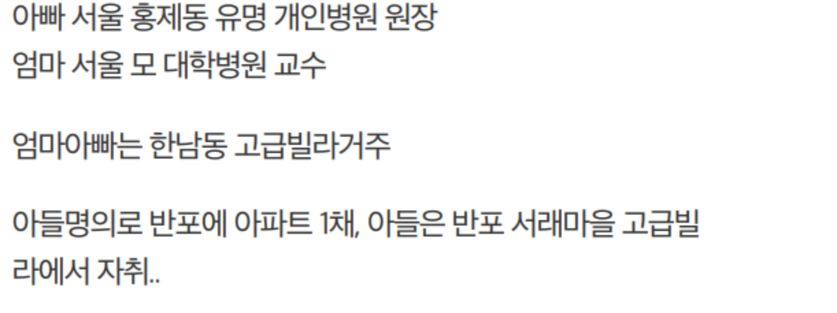 해당 게시물에 따르면 아버지는 병원원장이며, 어머니는 교수였다.