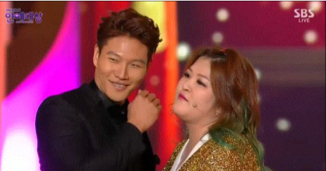 과거 SBS 연예대상 축하공연서 이국주가 김종국을 무대에 올라오게 해 입키스를 받아냈다.