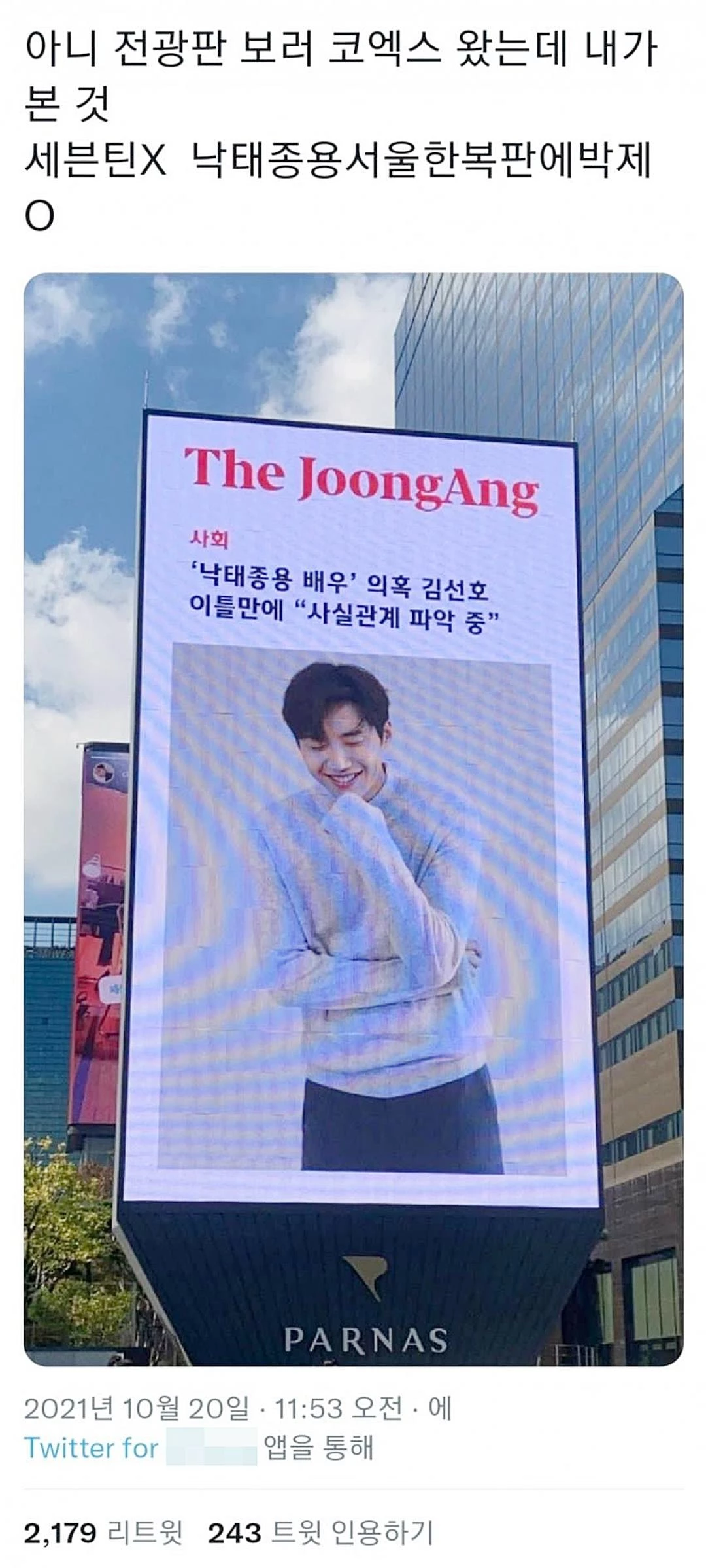 당시 전광판에는 김선호 관련 뉴스가 떠있었는데, 중앙일보가 전광판에 올린 사회 기사로 김선호 사진과 함께 “낙태 종용 배우 의혹 김선호. (소속사) 이틀 만에 ‘사실관계 파악 중'”이라고 적혀있었다.