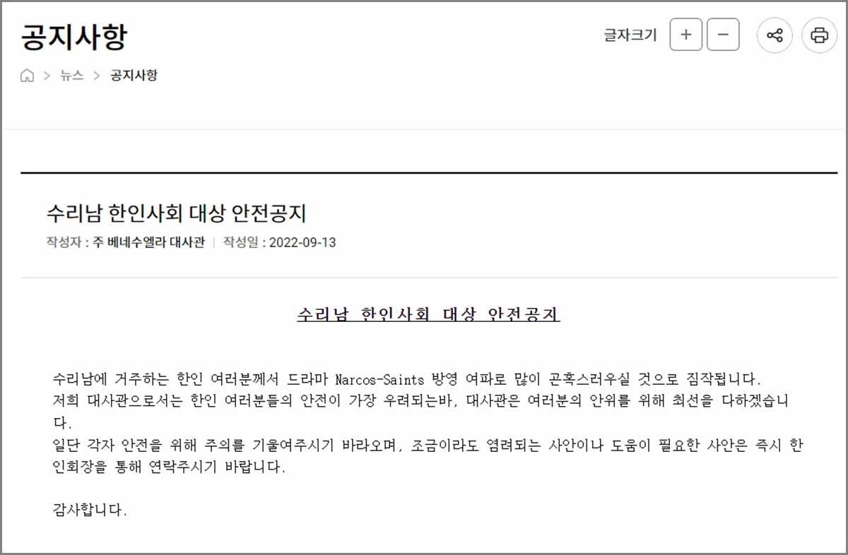 지난 15일 대사관은 홈페이지에서 “수리남에 거주하는 한인 여러분께서 드라마 ‘수리남’의 방영 여파로 많이 곤혹스러우실 것으로 짐작된다”라며 “대사관으로서는 한인 여러분들의 안전이 가장 우려되는 바, 대사관은 여러분의 안위를 위해 최선을 다하겠다”고 전했다.