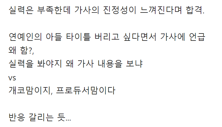 해당 게시물을 접한 누리꾼들은 “나 힙알못인디 몰입하게 만드는 랩이긴 했음..”,”그냥 지나치듯 듣는 랩도 많은데 뭔가 듣게 만드는 힘은 있더라”,”목소리 너무 좋던데”라는 반응과 반대로 “사연만 있는거아님..?그냥 그랬음..”라며 현재 다양한 반응을 보이고 있다.
