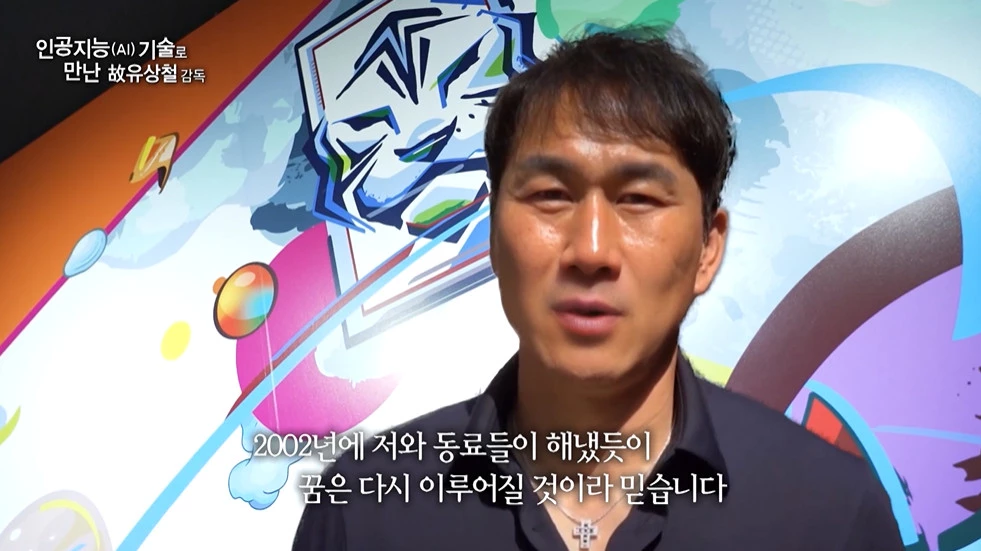 AI가 복원한 고 유상철 감독이 한국 대표팀에게 응원을 보내는 영상이 공개돼 화제이다.