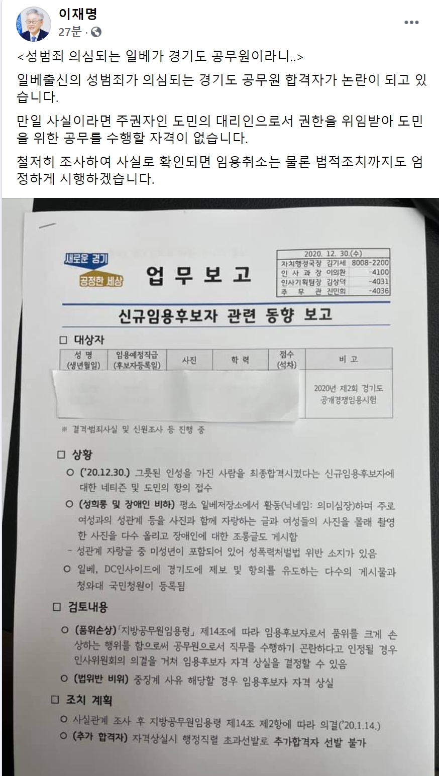 31일 이재명 지사는 자신의 페이스북에 성범죄 의혹을 받는 극우 성향 온라인 커뮤니티 일간베스트 저장소(일베) 회원이 경기도 7급 공무원에 합격한 것에 대해 입장을 밝혔다.