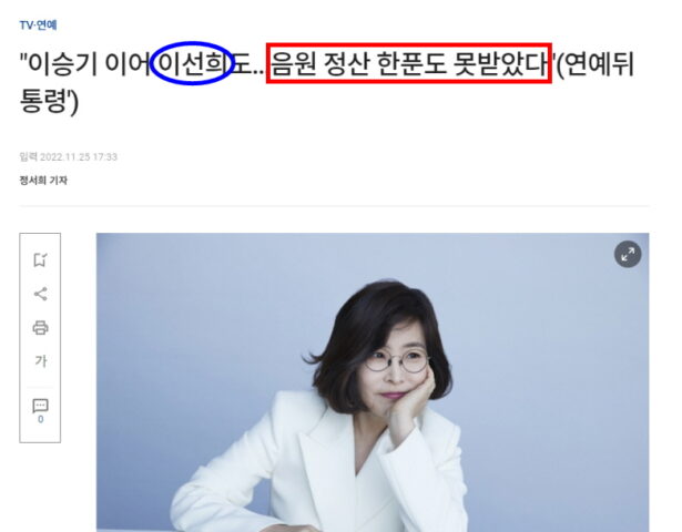 이에 각종 온라인 커뮤니티 사이트에는 “이승기 스승이었던 이선희는 왜 보고만 있었냐”는 반응이 이어졌고, 이선희 측에서도 “음원 정산을 한 푼도 못 받았다”는 입장을 발표했다.