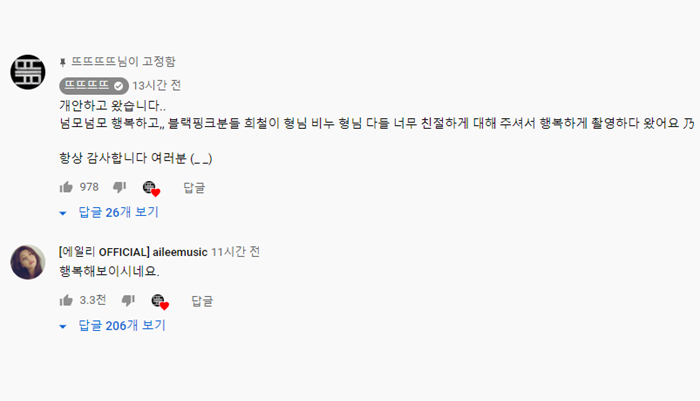 수많은 댓글 중 뜨뜨뜨뜨와 열애설에 휩사였던 가수 에일리가 직접 남긴 것도 있었다. 에일리는 “행복해보이시네요”라며 질투(?)가 섞인 댓글을 남겨 웃음을 자아냈다.