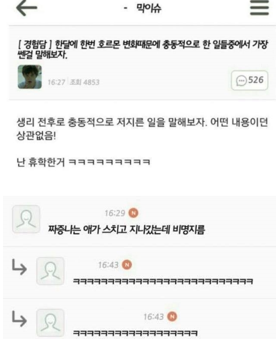 우리 생리 때 충동적으로한 일 가장 쎈거 말해보자!.