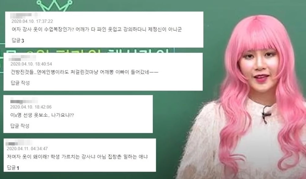 일부 네티즌들은 이지영 강사에게 댓글로 “저 여자 옷이 왜 이래? 학생 가르치는 강사냐 아니면 집창촌에서 일하는 애냐”, “여자 강사 옷이 수업 복장인가? 어깨가 다 파인 옷 입고 강의하다니 제정신이 아니군”, “이지영 선생 옷 보소. 나가요냐?” 등의 험담을 했다.