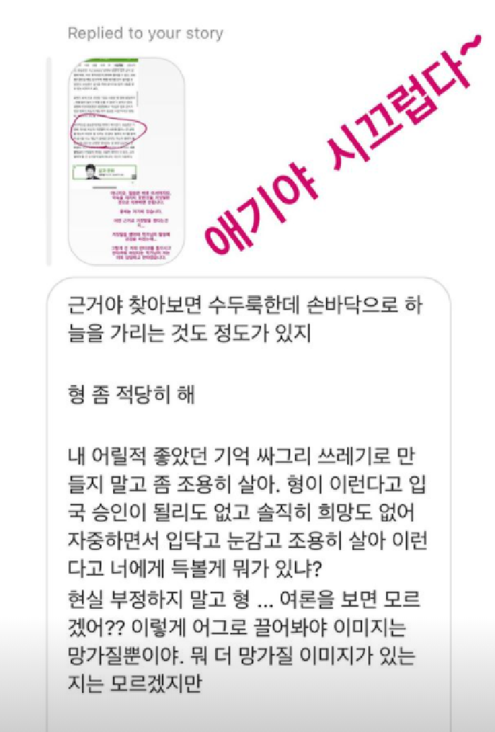 이런다고 너에게 득볼 게 뭐가 있냐? 현실 부정하지 마라”고 비난했다. 끝으로 “여론을 보면 모르겠어? 이렇게 어그로 끌어봐야 이미지만 망가질 뿐이야. 더 망가질 이미지가 있는지는 모르겠지만…”이라고 덧붙였다.