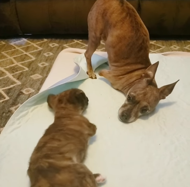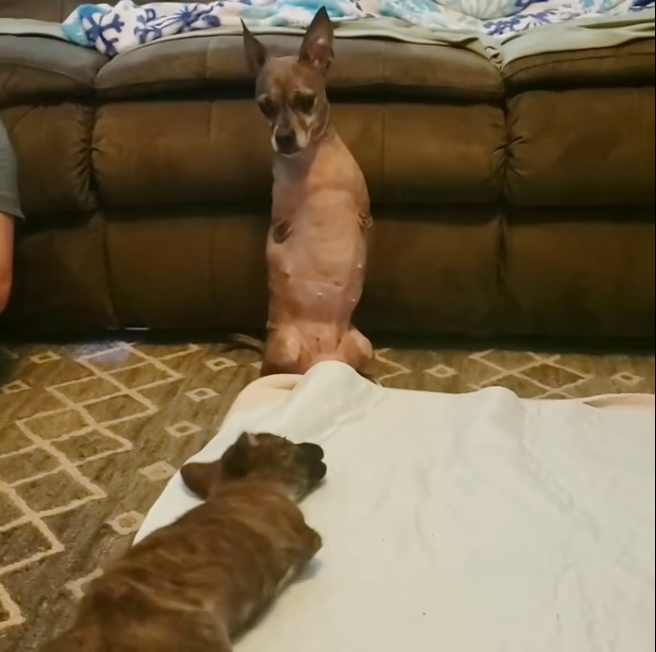 네시는 프랭키의 모습을 보며 따라서 일어나려고 했고, 프랭키가 넘어져도 네시는 곁에서 지키며 응원을 하는 것 같아 보였다.
