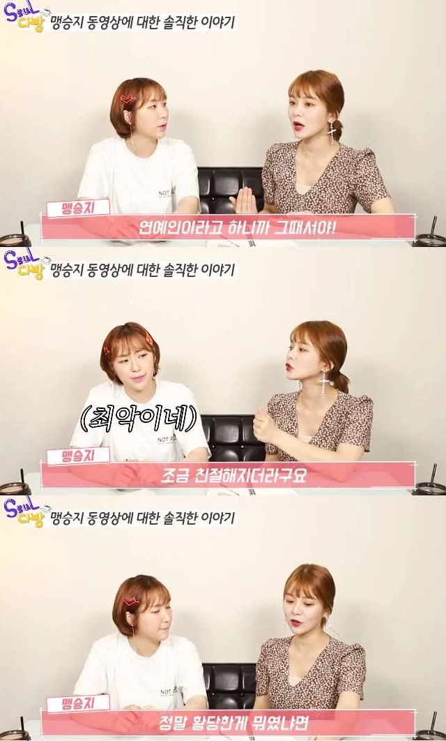 맹승지 씨는 “마스트를 쓰고 가서 ‘고소하려고 왔다’고 말했다. 그러자 한 경찰이 소파에 앉아서 ‘못 잡아요. 에이 그걸 어떻게 잡아요. 그걸 우리가 다 잡으면 한국에서 안 잡히는 사람이 어디있어요’고 하더라”