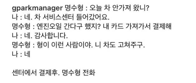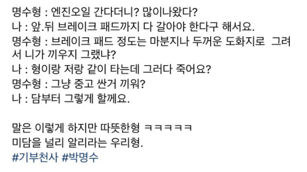 이어서 박명수는 “엔진오일을 교체한다더니 가격이 많이 나왔네?”라고 물었고, 이에 박명수 매니저는”브레이크 패드를 앞뒤 모두 교체해서 비용이 많이 나왔습니다”라고 답했다.