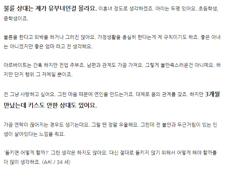 불륜 상대는 제가 유부녀인걸 몰라요. 이혼녀 정도로 생각하겠죠. 아이는 두명 있어요. 초등학생, 중학생이죠.