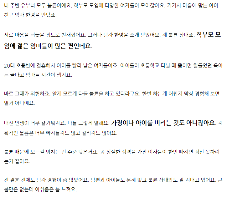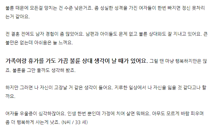 전 결혼 전에도 남자 경험이 좀 많았어요. 남편과 아이들도 문제 없고 불륜 상대와도 잘 지내고 있어요. 큰 불만은 없는데 아쉬움은 늘 느껴요.