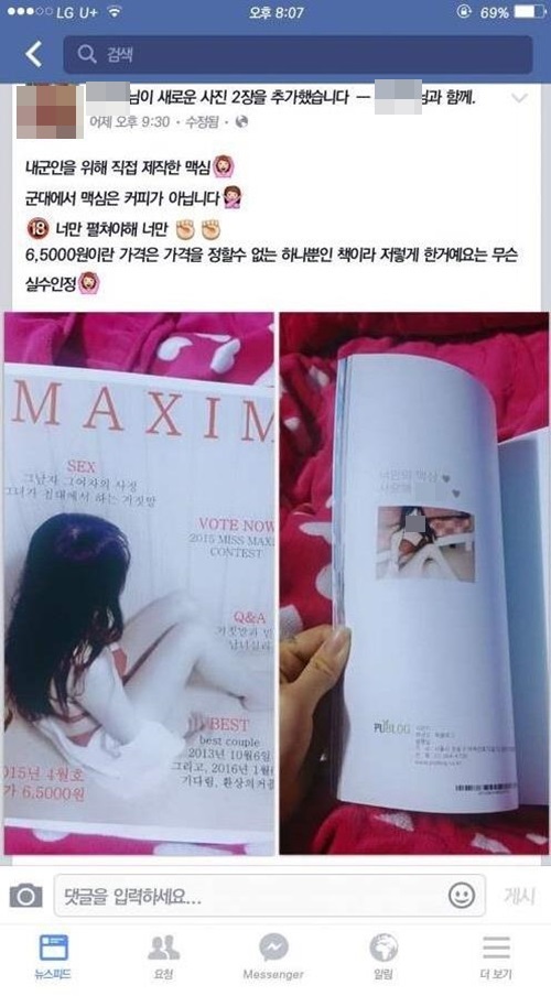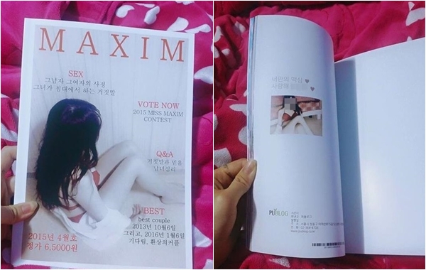 공개된 게시물은 “내 군인을 위해 직접 제작한 맥심’이라는 제목으로 고무신인 여자친구가 남자친구를 위해서 남성잡지 ‘맥심’을 직접 자신이 사진 찍어 제작한 후 선물해 화제가 된 것이다.