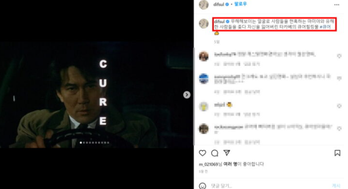 이설이 구로사와 기요시 감독이 연출한 영화 ‘큐어’의 장면들을 캡쳐해서 자신의 SNS에 게시하며 ”무해해보이는 얼굴로 사람들을 현혹하는 마미야와 유해한 사람들을 좇다 자신을 잃어버린 타카베의 큐어힐링물 #큐어”라는 글을 작성했다.