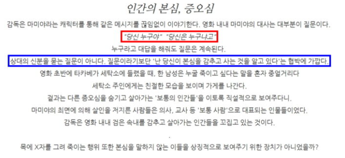 하지만 이 영화는 인간의 본심, 증오심을 이야기하는 작품으로 유명하며, 영화 내내 나오는 대사가 ”당신 누구야”, ”당신은 누구냐고”였다.
