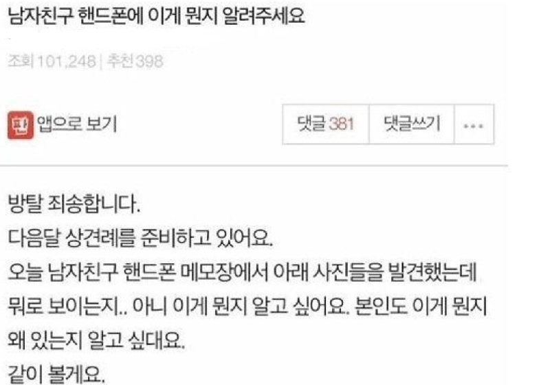 과거 한 온라인 커뮤니티에는 “남자친구 핸드폰에 이게 뭔지 알려주세요”라는 제목의 글이 올라왔다.