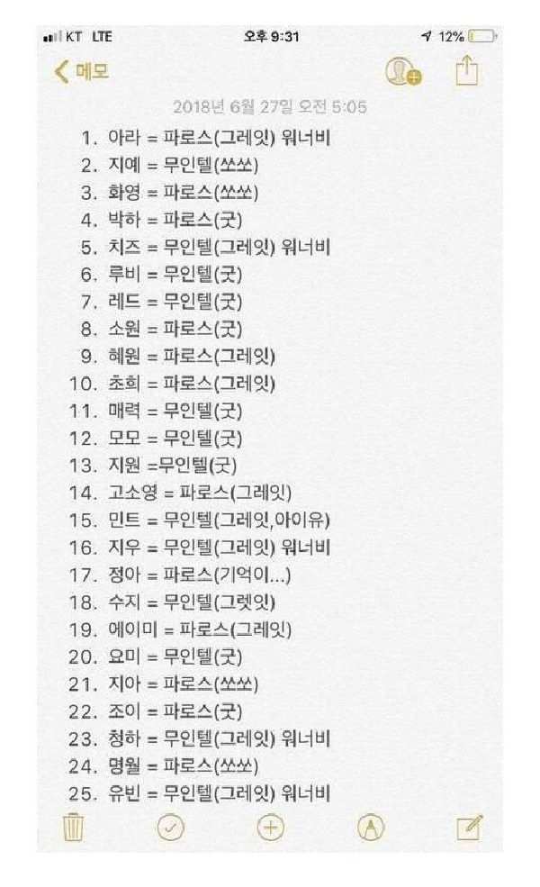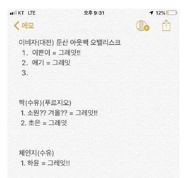 남자친구는 ‘체인지 수유’, ‘아라 파로스 워너비’, ‘화영 파로스 쏘쏘’ 등의 글을 적어 저장해놓았다.