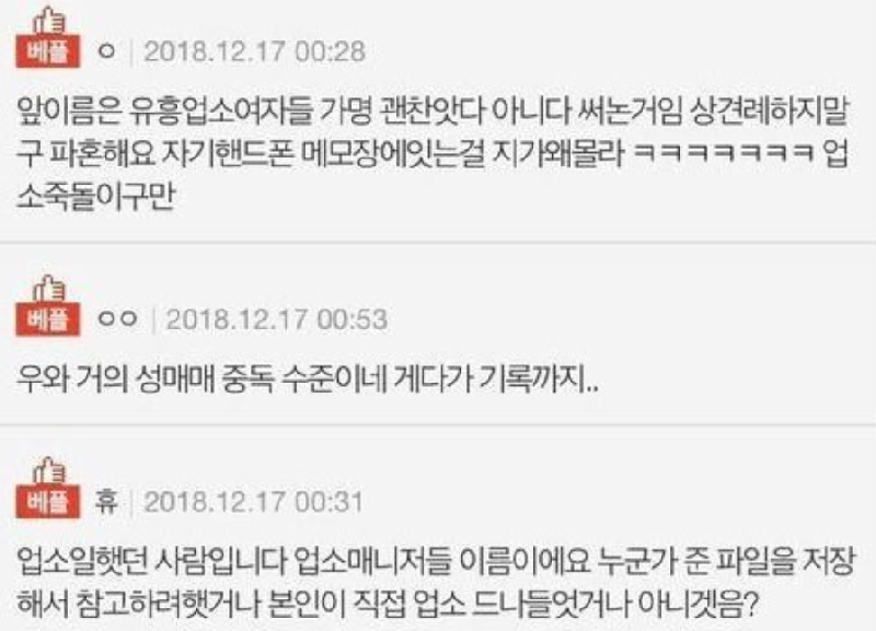이를 본 네티즌들은 남친이 적은 메모의 뜻을 추측했다. 네티즌들은 “앞이름은 유흥업소 여자들 가명 상견례하지말고 파혼해요. 핸드폰 메모장에 있는 걸 자기가 왜 모르냐”, “누군가 준 파일을 저장해서 참고하려 했거나 본인이 직접 업소 갔거나 아니겠냐”등의 댓글을 달았다.