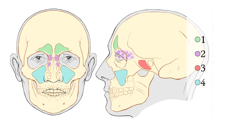 부비동은 얼굴 뼈에 공기가 차 있는 공간으로 코 주위에 좌우 두 개씩 총 네 개의 부비동이 존재하고 있다.