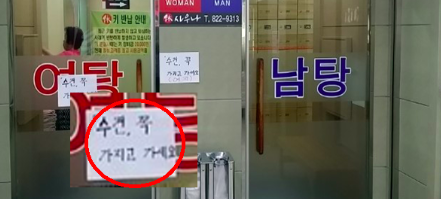 그 이유는 나이든 아주머니들이나 할머니들 때문인데 목욕탕 수건을 “내가 내 돈내고 들어가는데 집에 가져가면 안돼?”, “나는 절약정신이 투철한 알뜰한 사람.” 같은 마인드로 가져가는 일이 많기 때문이다.