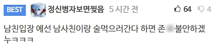 A씨의 게시물을 본 일부 네티즌은 “남친입장 에선 남사친이랑 술먹으러간다 하면 존나불안하겠누ㅋㅋㅋ” 라 댓글을 남겼다.