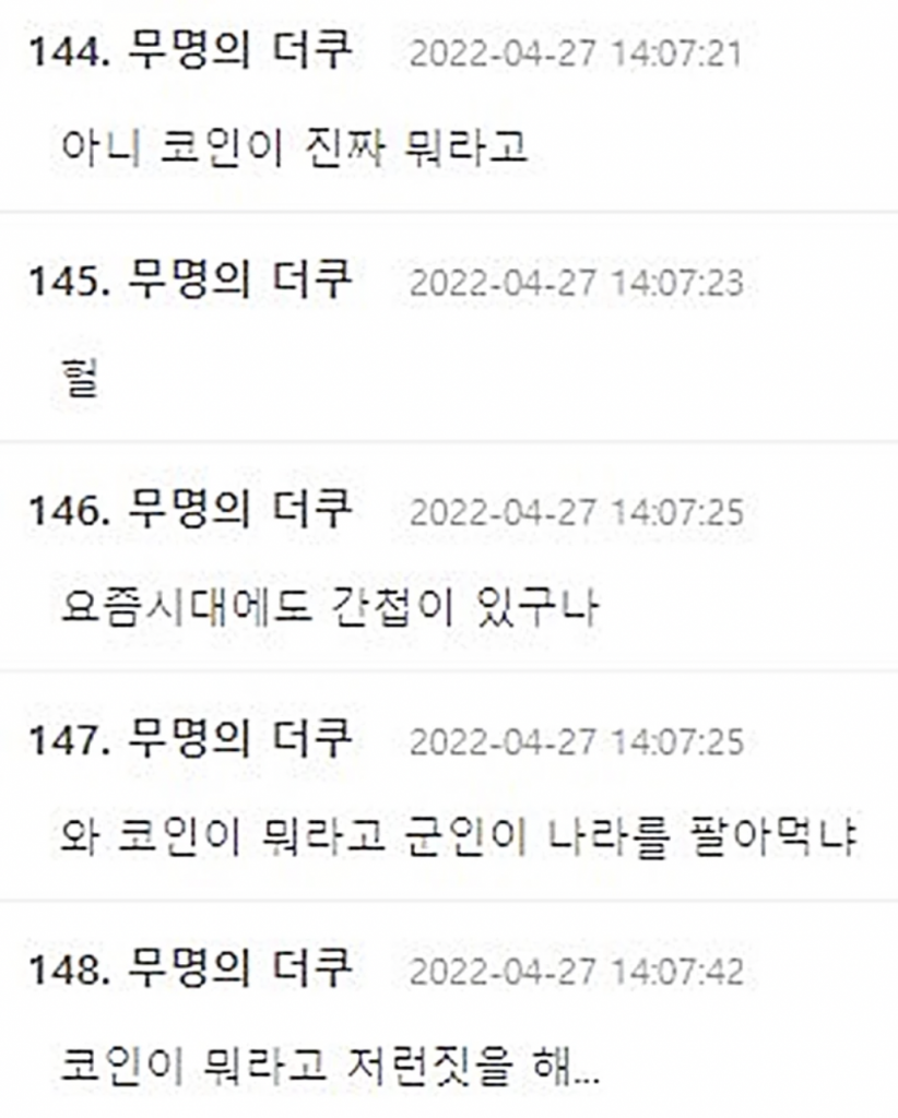 해당 소식을 접한 네티즌들은 “요즘 시대에도 간첩이 있구나”, “코인이 뭐라고 나라를 팔아먹냐” 등의 반응을 보이며 당혹감을 감추지 못했다.