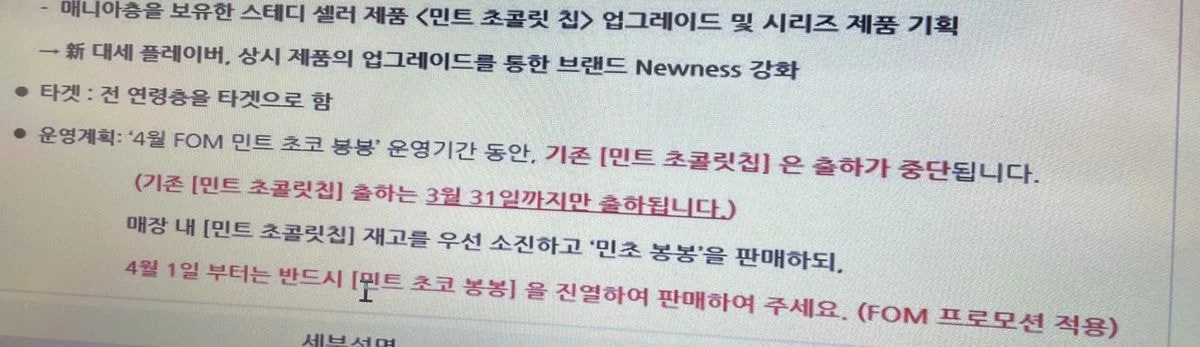 4월 1일부터는 무조건 ‘민트 초코 봉봉’으로 진열을 바꿔 판매하라를 안내문도 적혀 있었다.