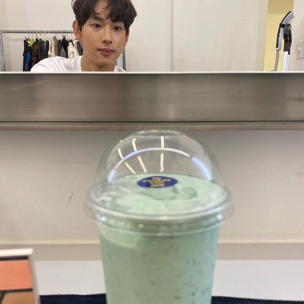공개된 사진 속 임시완은 대기실에서 민트 초코맛 음료를 앞에 두고 거울을 바라보며 사진을 찍고 있다.
