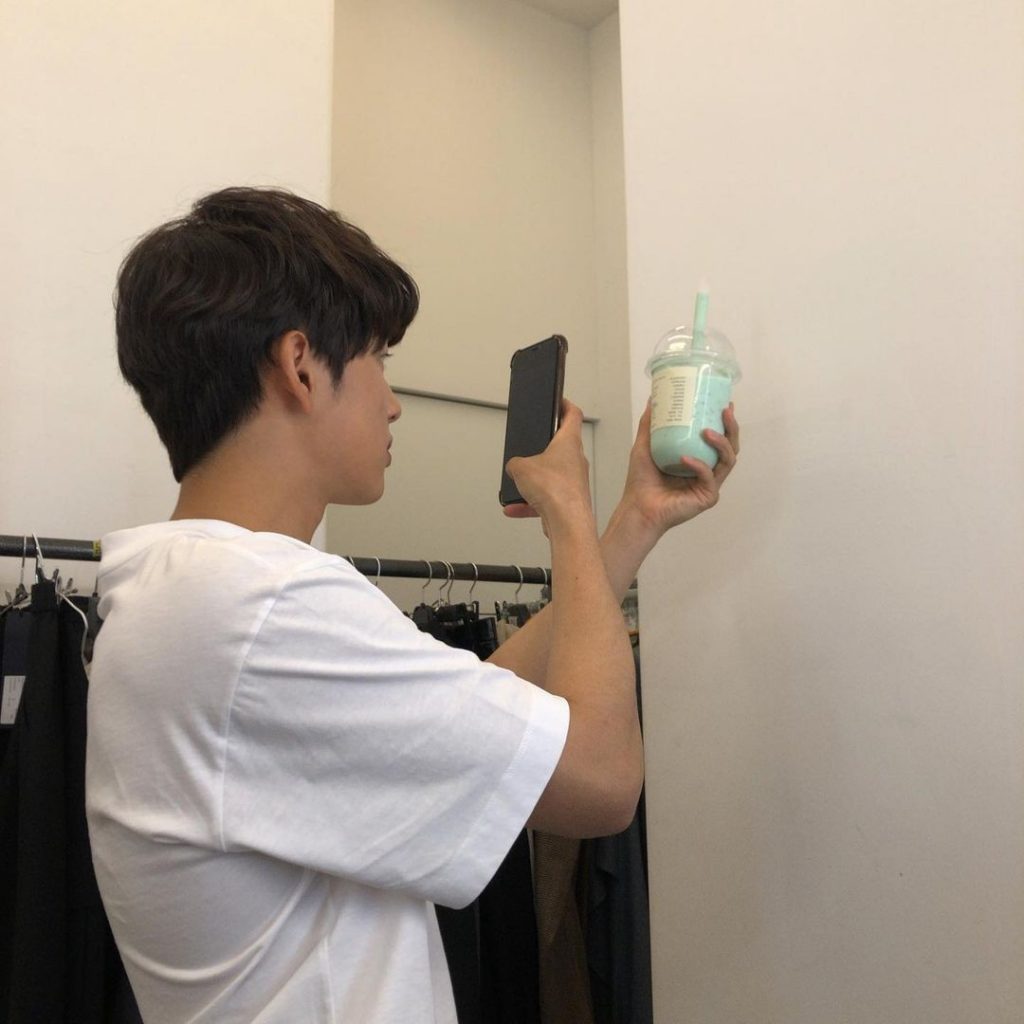 민트 초코 음료를 찍기 위해 카메라를 바라보며 집중하고 있는 임시완은 훈훈한 비주얼에 시선을 사로잡는다.