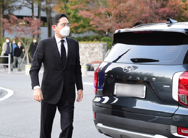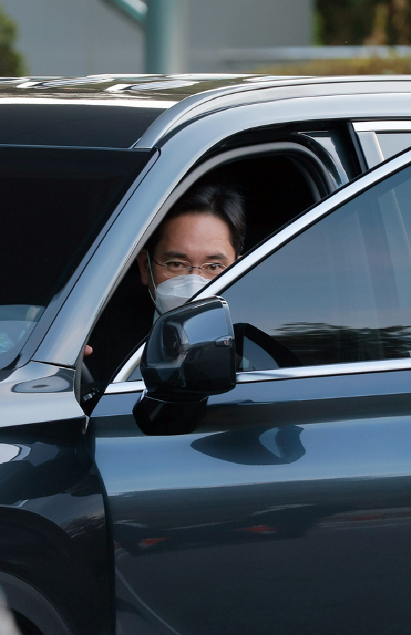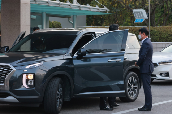 이 부회장은 흰색 마스크를 쓰고 굳은 표정으로 차에서 내렸다. 이 부회장이 직접 몰고 온 차량은 현대자동차 대형 SUV ‘팰리세이드’다.