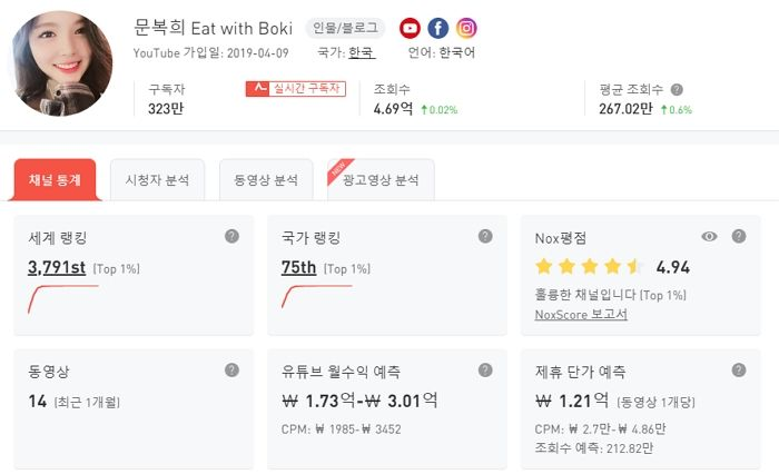 11일 유튜브 분석 플랫폼 녹스 인플루언서에 따르면 문복희의 유튜브 채널 예상 수익은 월 6천만원에서 1억원 사이로 나타났다.