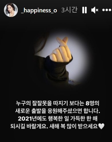 미나는 오늘(1일) 자신의 인스타그램 스토리에 “누구의 잘잘못을 따지기보다는 8명의 새로운 출발을 응원해주셨으면 한다”면서 “2021년에도 행복한 일 가득한 한 해 되시기 바란다”고 요청했다.