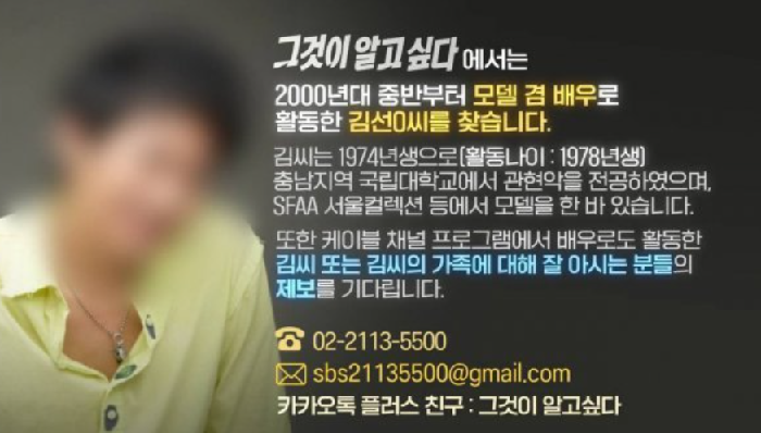 ‘그알’ 측은 “2000년대 중반부터 모델 겸 배우로 활동한 김선ㅇ씨를 찾는다”며 “김 씨는 1974년생으로(활동 나이: 1978년생) 충남지역 국립대학교에서 관현악을 전공하였으며, SFAA 서울컬렉션 등에서 모델을 한 바 있다”고 말했다.
