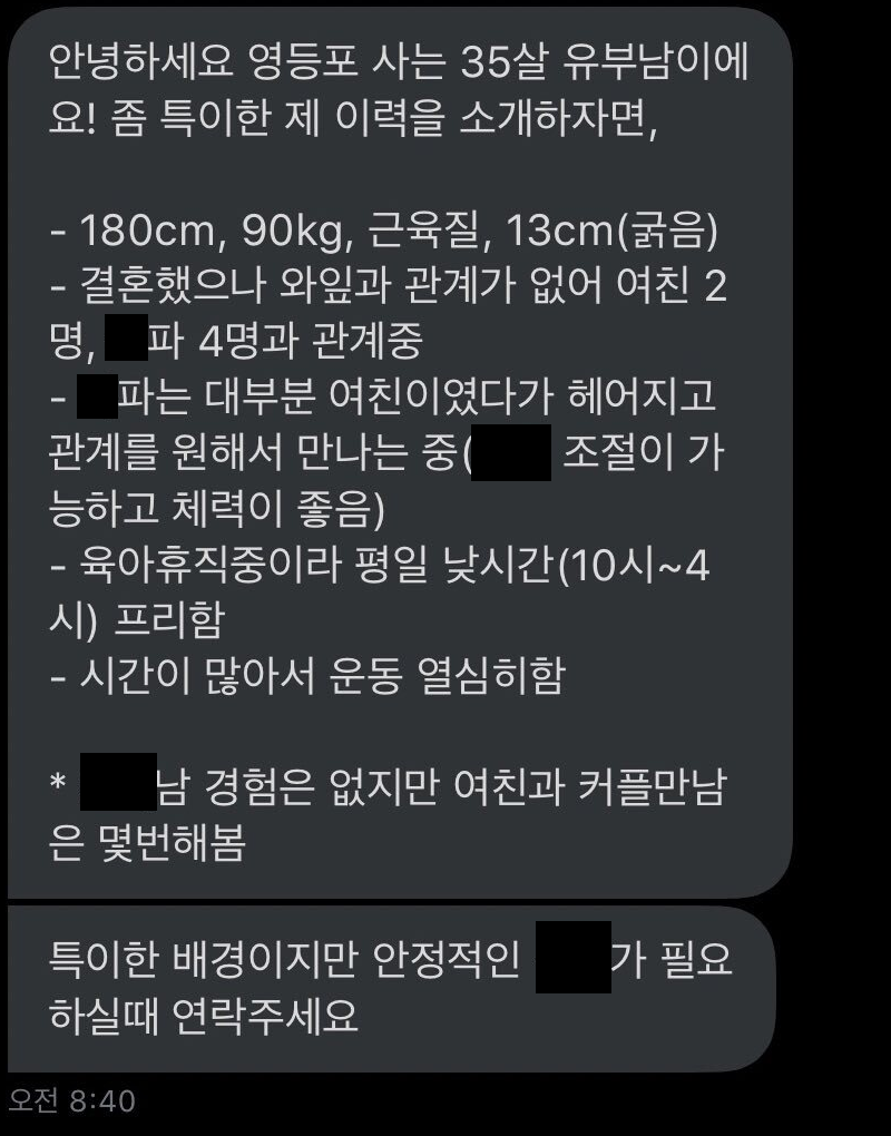 이어 그는 “육아 휴직 중이라 평일 낮 시간(10시~4시) 프리함. 시간 많아서 운동 열심히 함. 특이한 배경이지만 안정적인 X스가 필요하실 때 연락주세요”라고 덧붙였다.